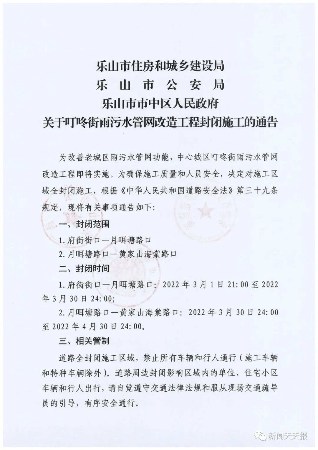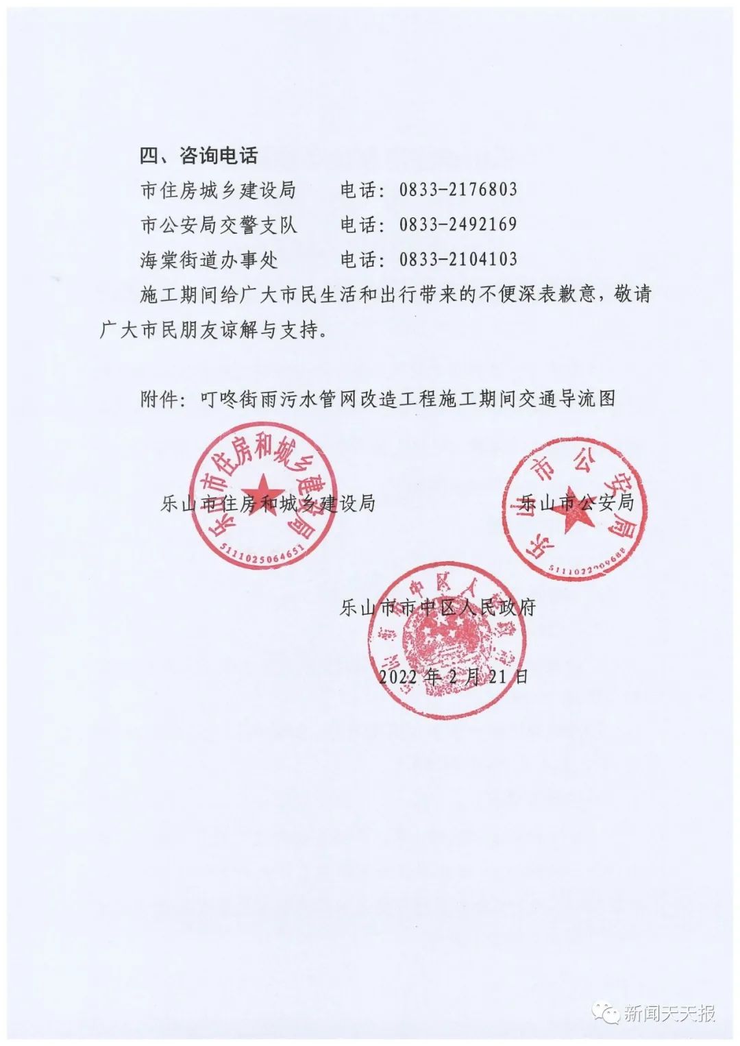 三、沿线居民交通保障:施工期间施工路段仅供两轮车和行人通行,沿线居民车辆由城投公司提供就近黄家山停车场、府街停车场、上中顺停车场供居民在施工期间免费停放。