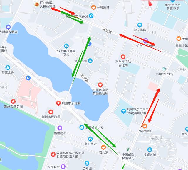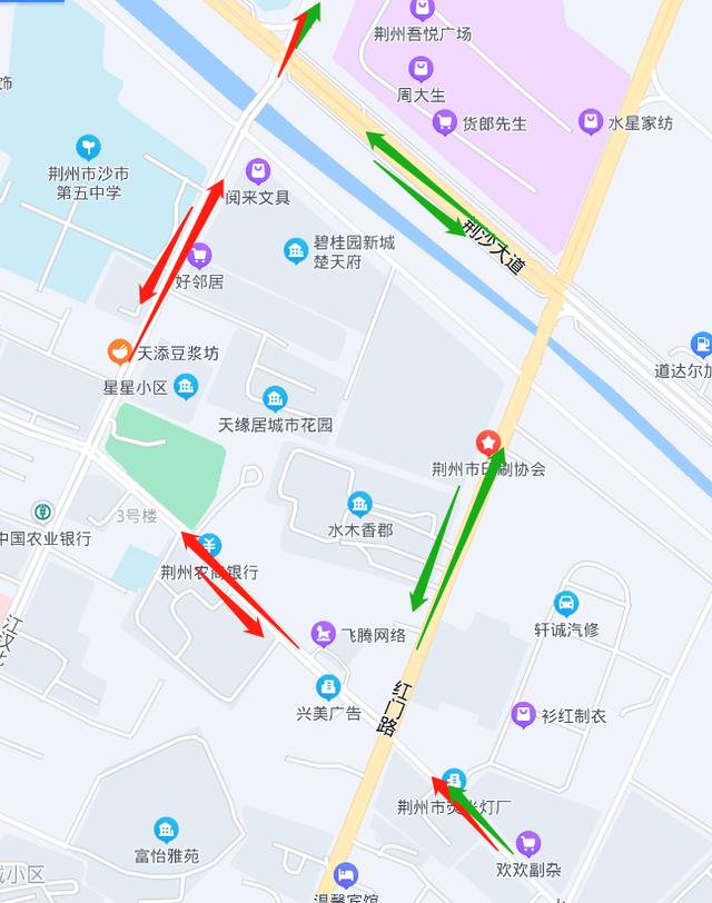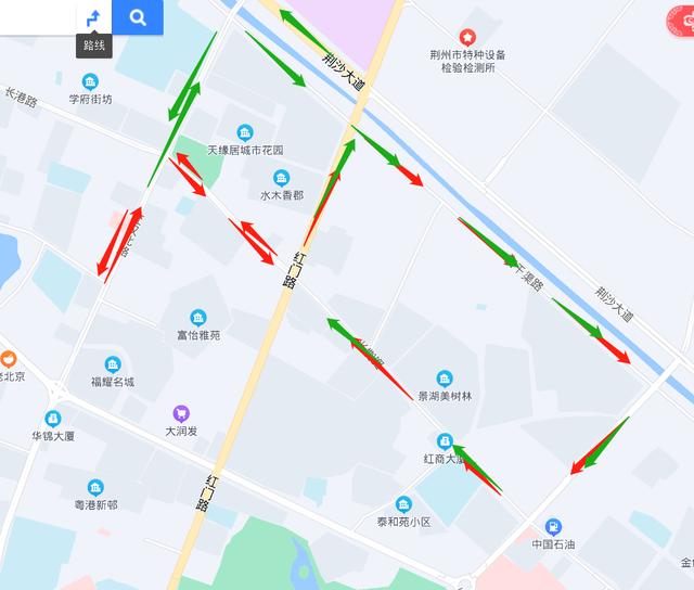 红色箭头为原行驶路线,绿色箭头为绕行路线。