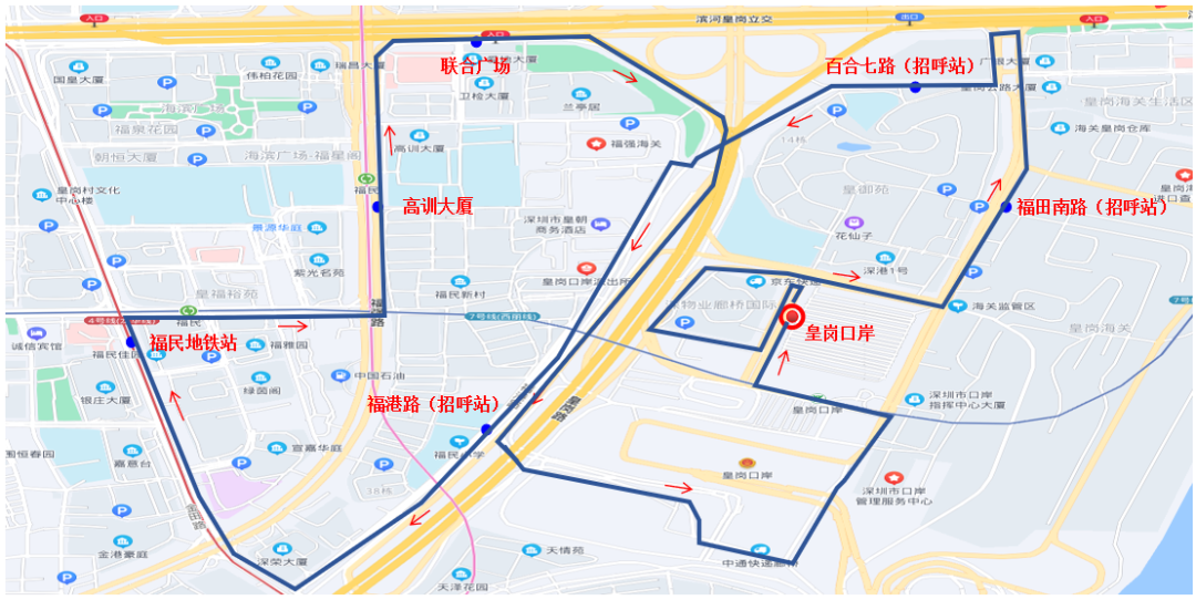 皇岗口岸、福田南路(招呼站)、百合七路(招呼站)、福港路(招呼站)、福民地铁站、高训大厦、联合广场、皇岗口岸。