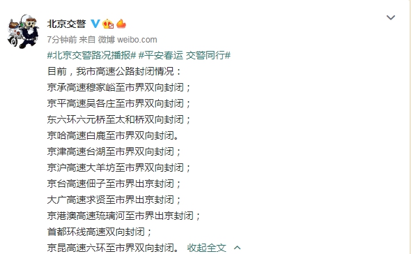 据“北京交警”微博14日8:03通报,京承高速穆家峪至市界双向封闭,京平高速吴各庄至市界双向封闭,东六环六元桥至太和桥双向封闭,京哈高速白鹿至市界双向封闭,京津高速台湖至市界双向封闭,京沪高速大羊坊至市界双向封闭,京台高速佃子至市界出京封闭,大广高速求贤至市界出京封闭,京港澳高速琉璃河至市界出京封闭,首都环线高速双向封闭,京昆高速六环至市界双向封闭。
