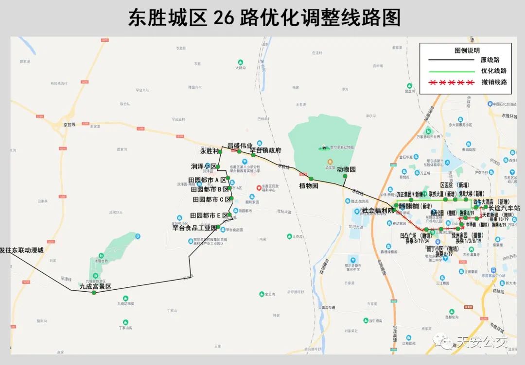 长途汽车站-铁牛大酒店(新增)-党政大楼(新增)-东胜区医院(新增)-联邦大厦(新增)-万正集团(新增)-青铜器博物馆(新增)-社会福利院-动物园-植物园-罕台镇政府-昌盛伟业-永胜村-润泽小区-田园都市A区-田园都市B区-田园都市C区-田园都市E区-罕台食品工业园-九成宫景区-东联动漫城。