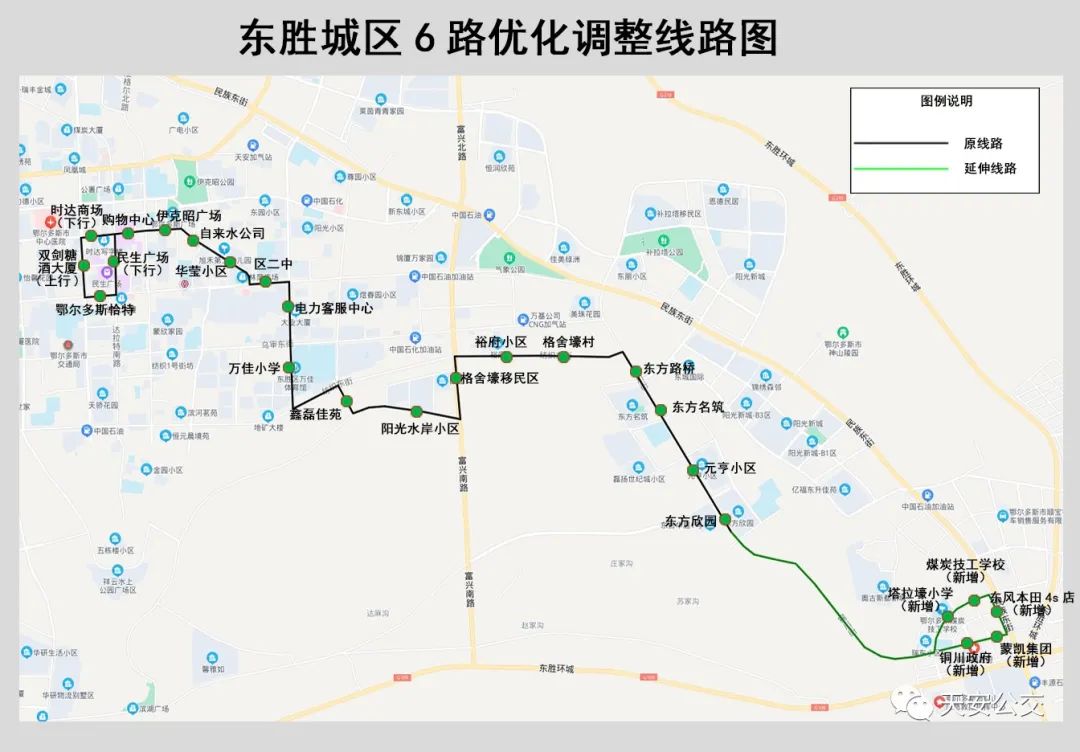 将6路终点站东方欣园经铜川街延伸至铜川镇,新增塔拉壕小学,煤炭技工学校、东风本田4s店、蒙凯集团、铜川政府站点。