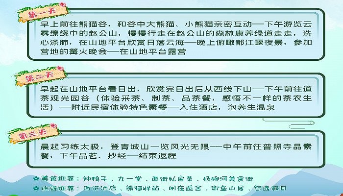 都江堰宣传部供图若是生活太压抑,看看憨态可掬的熊猫,心情便能好起来。再趁着春日的好天气登上赵公山,欣赏日出日落、广阔云海。一路来到青城山,打打太极,感悟“青城天下幽”,在道茶观光园体验茶农生活,在普照寺里消磨时光。冬日太沉寂,便让和煦春风带走它,山里的春天便悄悄来到。