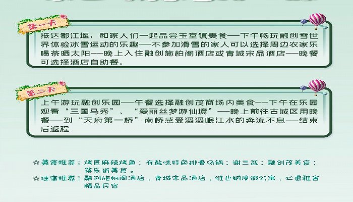都江堰宣传部供图这里可以打卡冬奥会冠军“同款”滑雪场,还能挑战各种惊心动魄的游乐设施,也能观看“三国马秀”、“爱丽丝梦游仙境”表演。到都江堰,融创文旅城是您携家人朋友娱乐的好地方。融创乐园、融创雪世界、融创茂,还有融创精品酒店已经为您打包就绪。