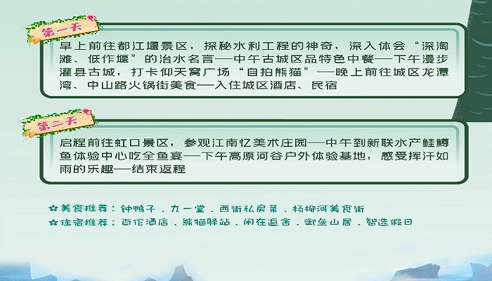 致敬世界遗产之旅、熊猫秘境探索之旅、西部地理发现之旅、康养休闲度假之旅、山地运动之旅、夜游都江堰之旅……多形态的沉浸式体验式项目,预示着未来的都江堰将走出一条以世界遗产为依托的文旅发展之路,擦亮世界遗产城市品牌。